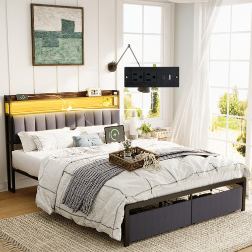 Upholstered Bed Frame with Storage,LED Lights & Type-C & USB Charging Ports, Grey